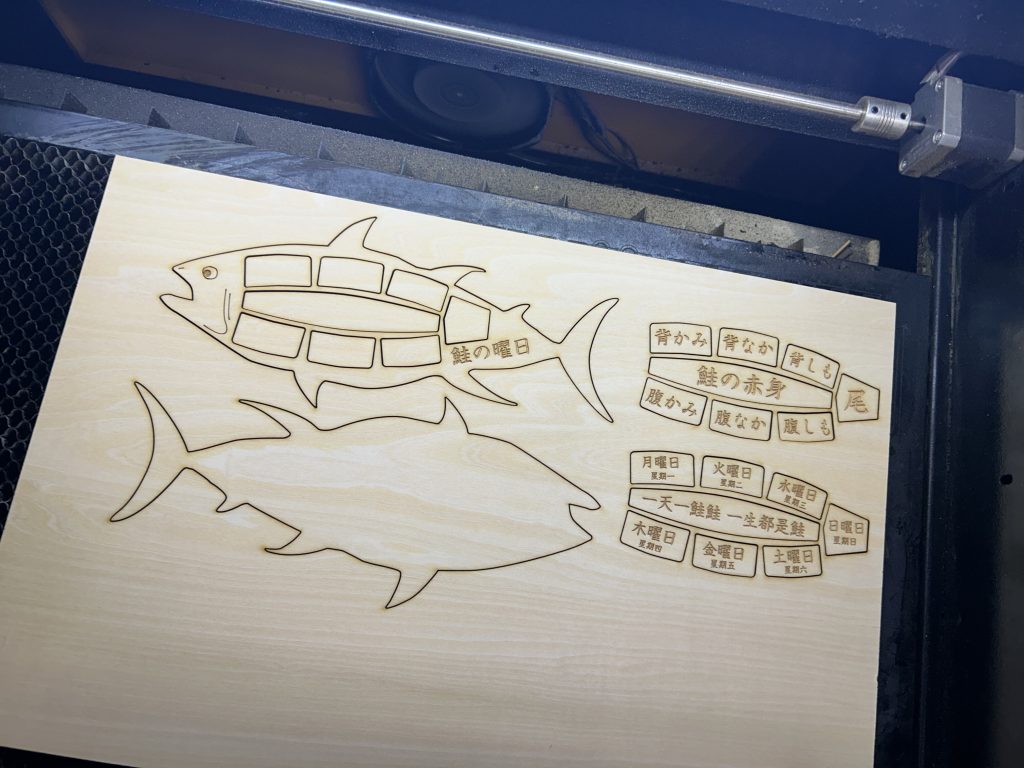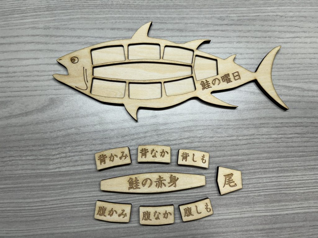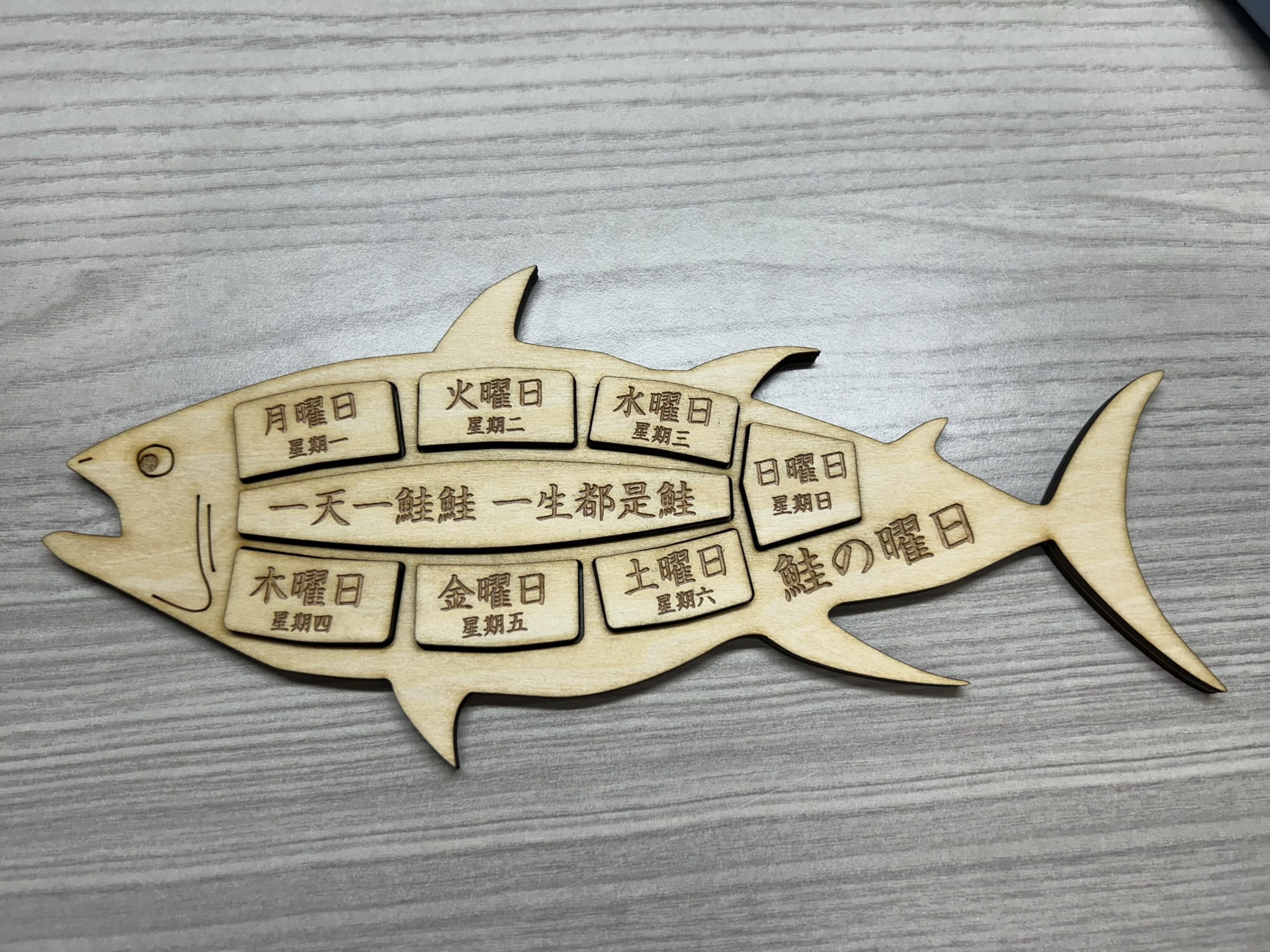 這是一款以「鮭魚計日板」為名的創意實用小物,融合了日常生活與食魚文化的教育理念。以雷雕木製方式精緻製作,每一塊拼圖代表鮭魚身上的不同部位,並刻有相應的日文名稱,如「背かみ(上背)」、「腹なか(腹中)」、「尾(尾部)」等,不僅具有趣味性,也富含知識價值。