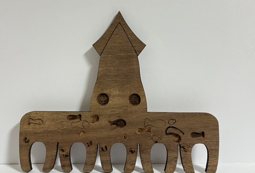 這是一款以章魚為靈感設計的木質小物,造型俏皮、工藝精緻。主體採用原木材質雷雕而成,呈現溫潤自然的手感與獨特木紋質感。章魚的腳被巧妙設計為掛鉤或梳子的造型,可用來掛鑰匙、飾品,亦可作為髮梳,兼具裝飾與實用功能章魚身上細緻刻有多隻小魚圖案,增添海洋趣味與童趣氛圍,極具設計感與地方風格,適合作為旅遊紀念品或文創小物。