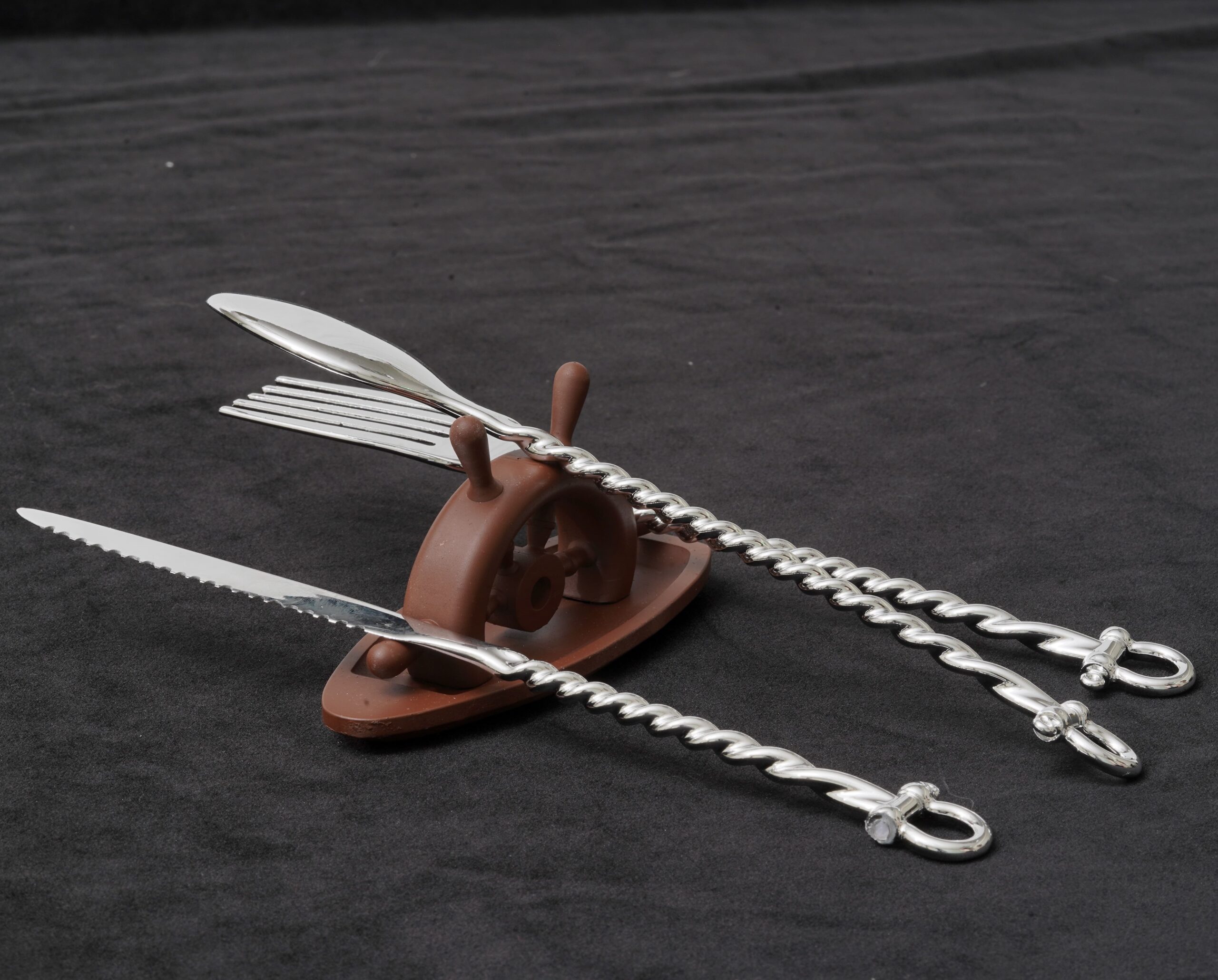 將「連結繩索的卸扣」造型融進餐具組中,再搭配上以「小船+船舵」為意象的餐具架,讓整體富有趣味性。餐具架可拆卸的設計可節省空間。