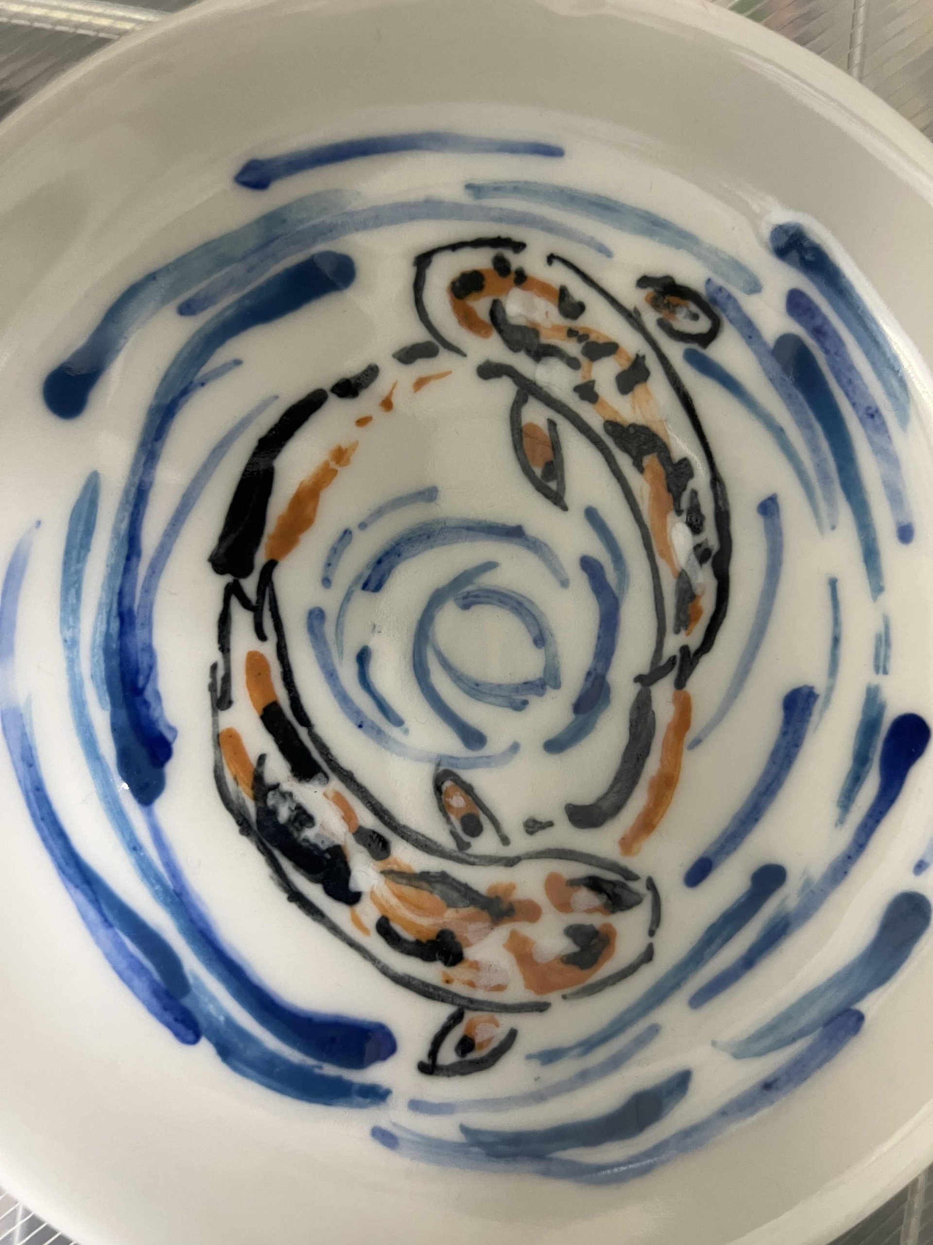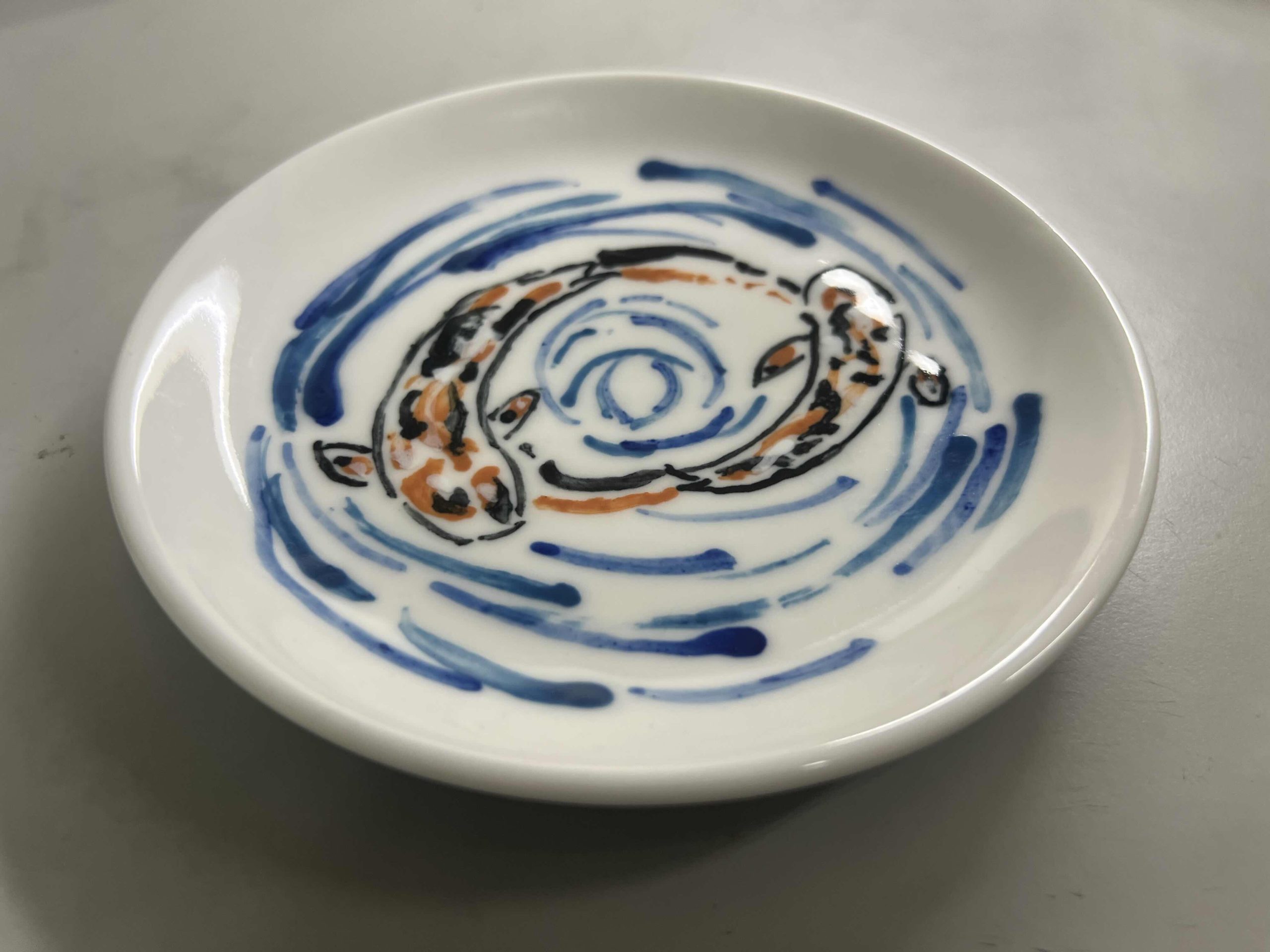在這只小巧的陶瓷碟上,兩條靈動的鯉魚優雅地在水波中穿梭,彷彿彼此追逐又和諧共舞。以手繪風格描繪出一紅一綠的鯉魚,象徵陰陽調和、吉祥與圓滿,水波紋環繞其中,彷彿時間在此刻凝止。