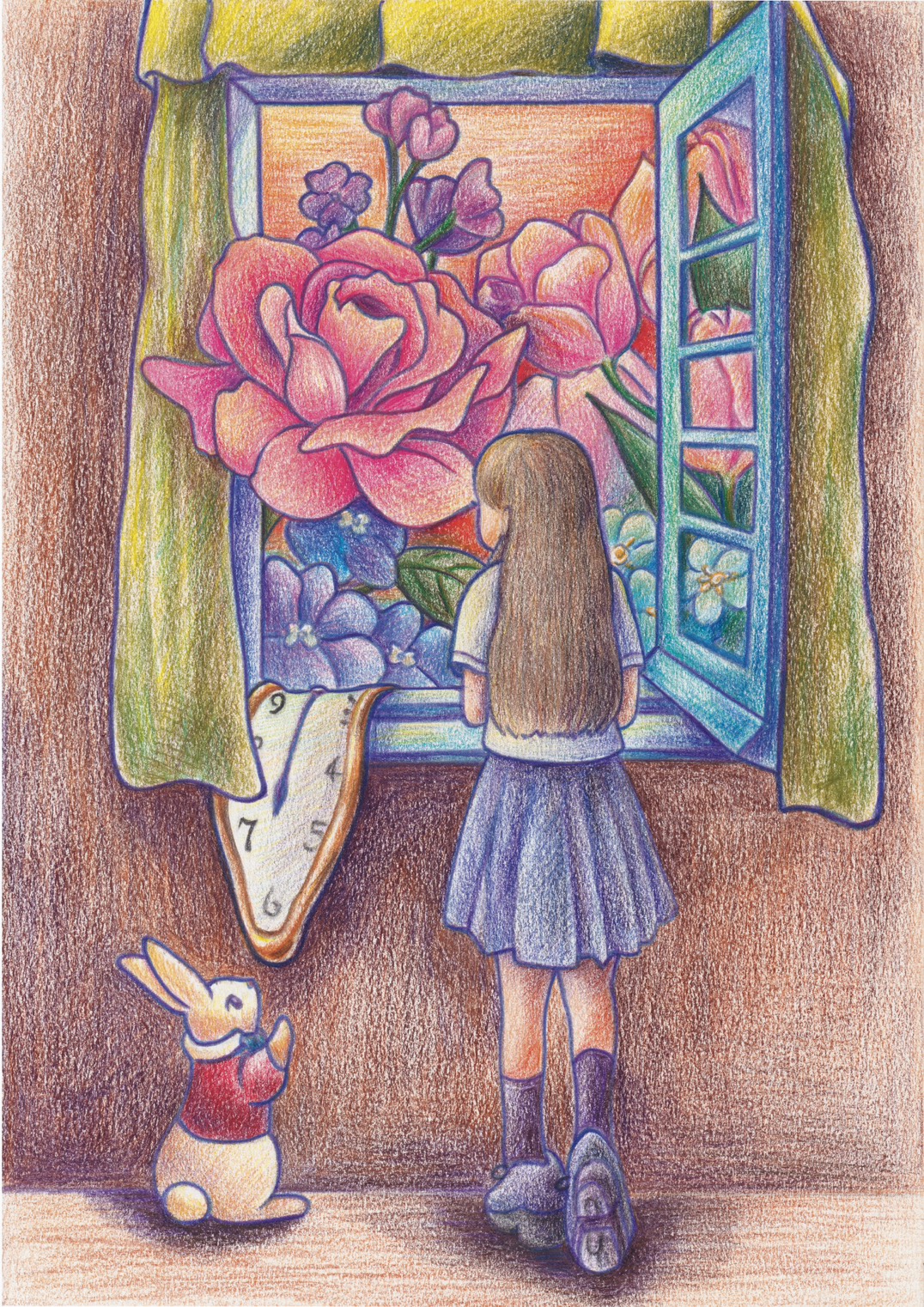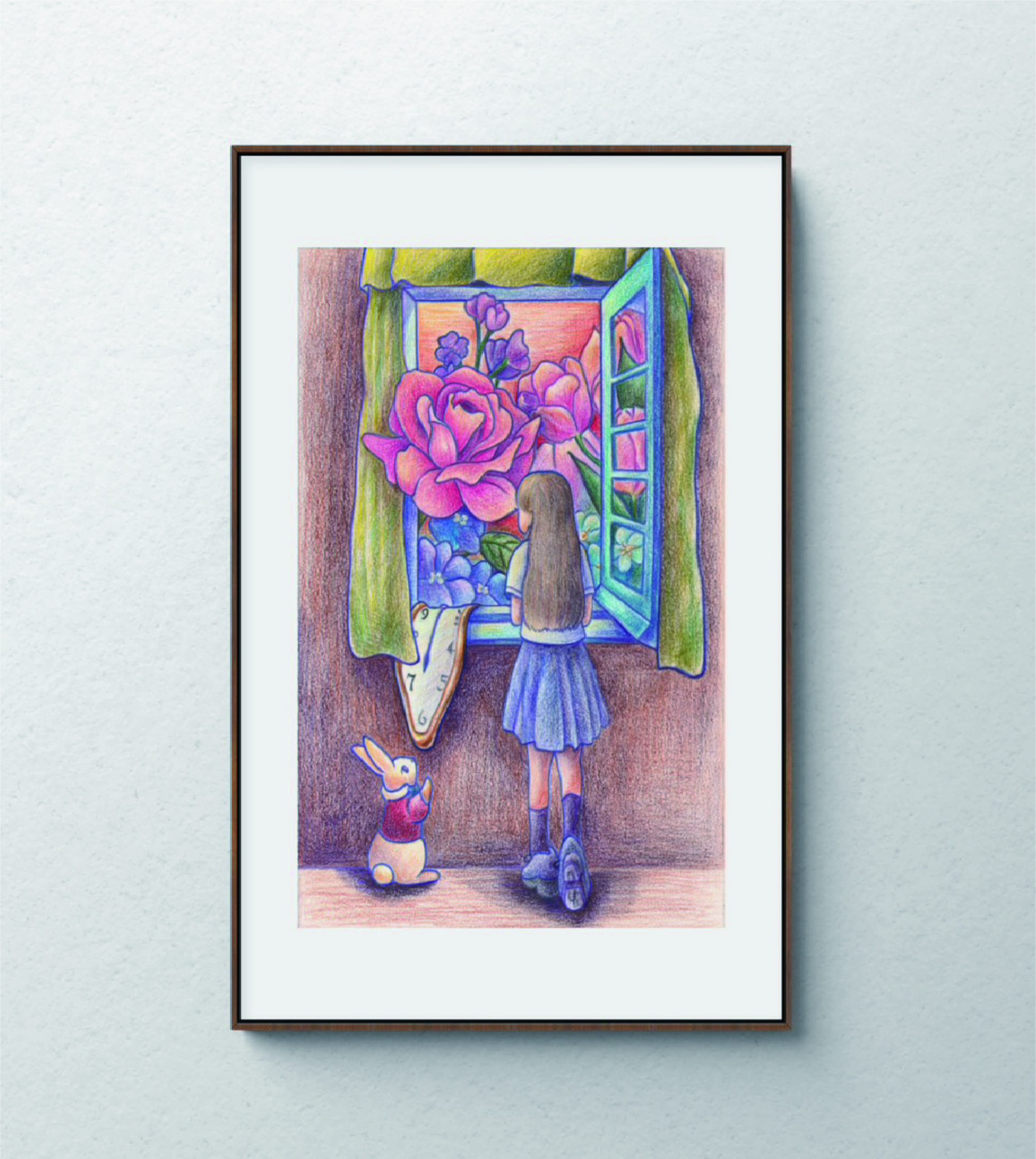 這幅作品以「花開時,時間睡著了」為題,模仿達利的《在窗口的女子 Woman at the Window》的構圖,加入了愛麗絲的夢遊仙境裡的元素,和達利的《記憶的堅持》裡的流體時鐘,營造出一種夢幻與靜謐的形象,象徵時間的童話與生命瞬間永恆之美的奇幻花園,玫瑰與其他花朵在陽光中綻放,猶如一個美麗的時空片段。兔子站在女孩身邊,穿著童話般的衣服,既是觀察者,也是引路人與現實奇幻的連結者。窗外的花園並非只是物理空間,而是女孩內心深處的視覺記憶,是一個擺脫時間束縛的瞬間,當我們凝視花開,凝視世界的美好,時間將為我們短暫駐足。
