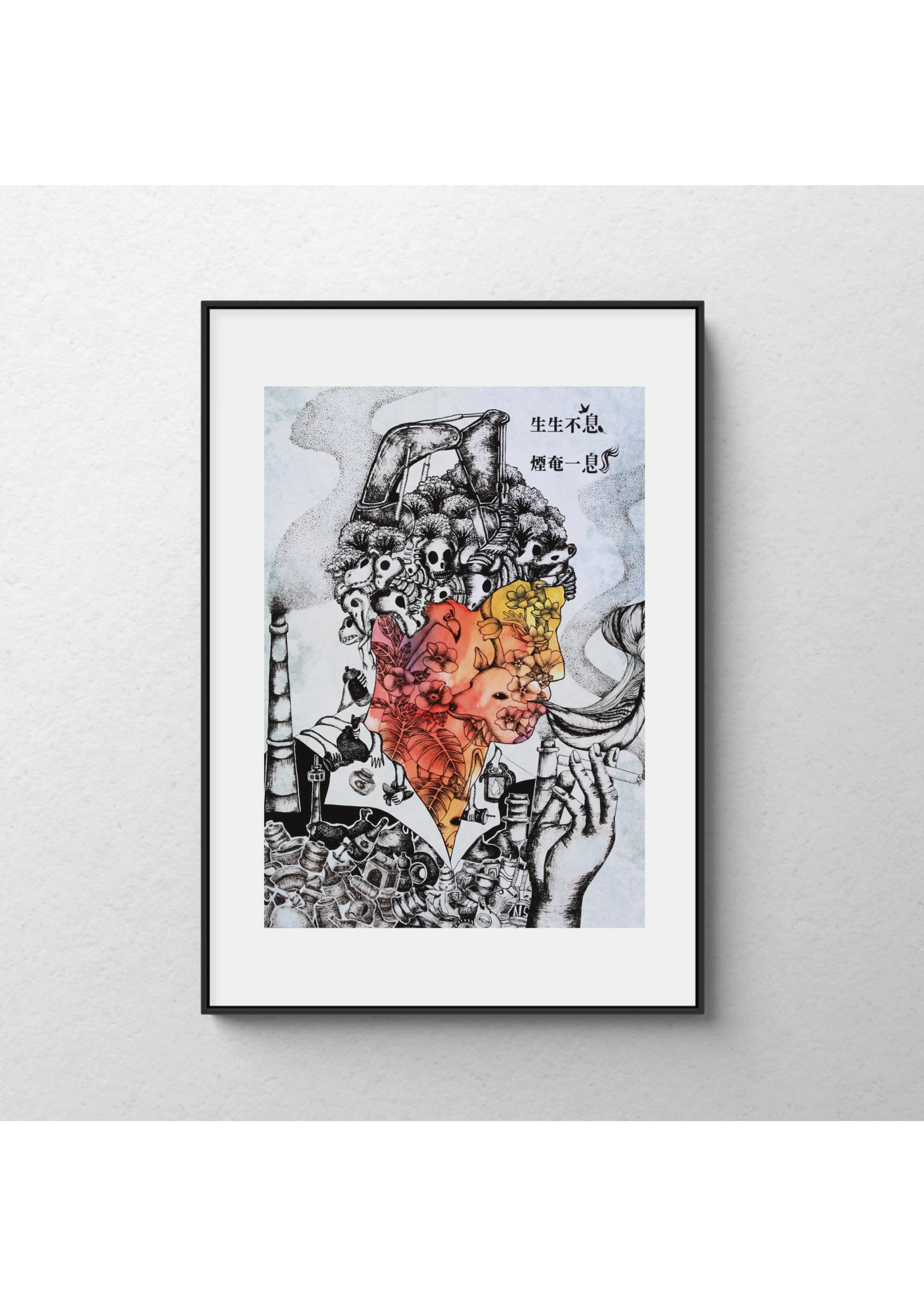 《生生不息,煙奄一息》描繪一個由萬物構築的人形:骷髏、煙囪、機械與塑膠堆疊成污染的現實,而動物、花朵與枝葉則在彩色區域綻放,如同最後殘存的純淨生機。這不是科幻,而是我們正在呼吸的世界。