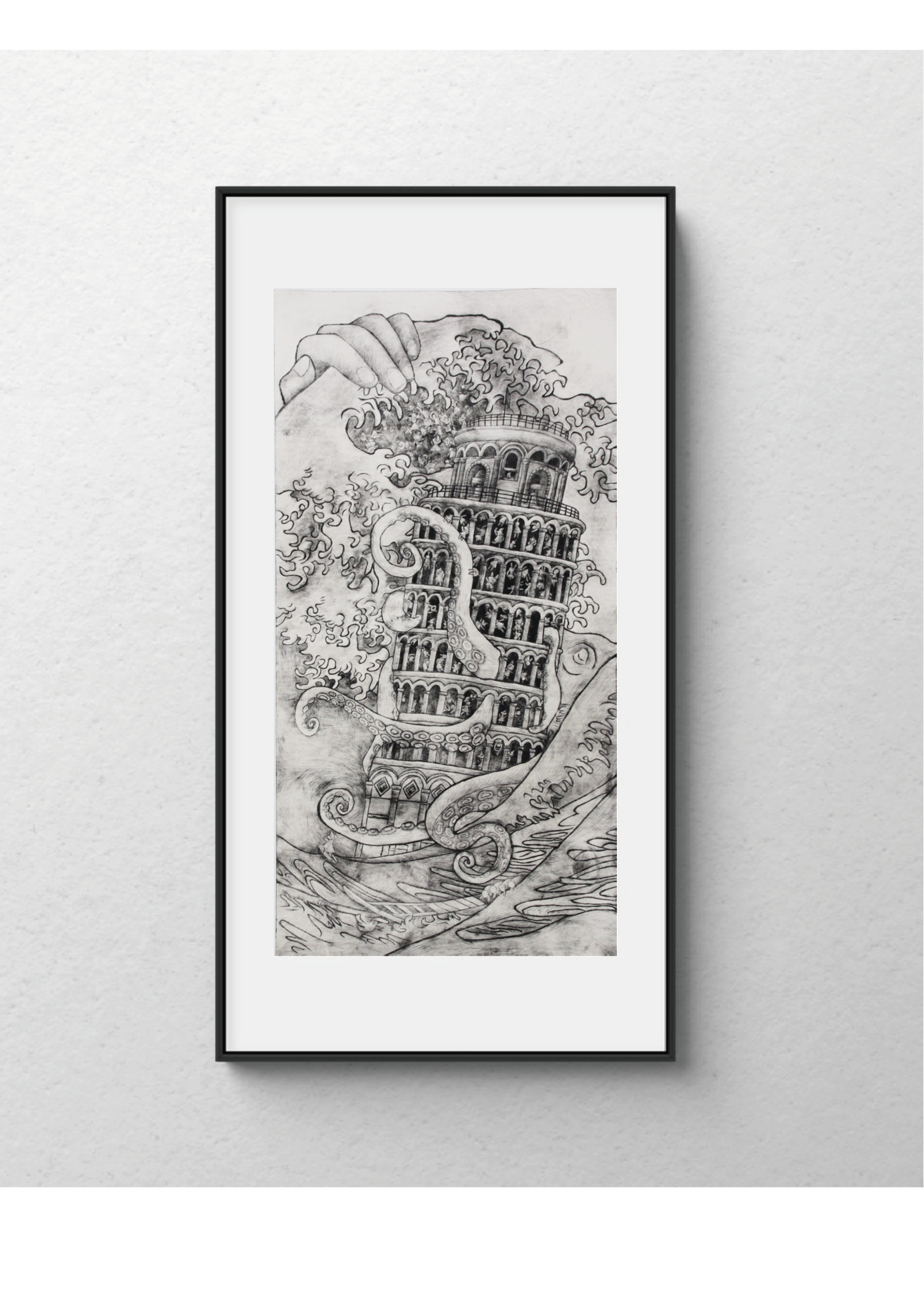 《浪尖上的比薩》將我們熟悉的比薩斜塔,擺進一場狂浪與觸手的劇場。那隻海怪盤據塔身,盤根錯節地糾纏著層層圓拱,彷彿文明的根基早已深陷不可控的深淵。塔內的人們卻依然如常地穿梭其間,彷彿對即將來襲的巨浪與觸手視而不見。