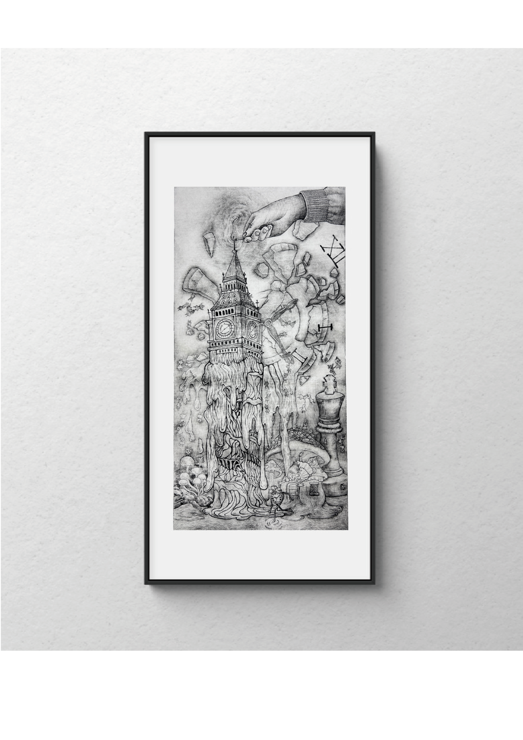 畫面中央,那隻手輕輕將火柴劃燃,並非出於破壞,而更像是喚醒。一場關於秩序、記憶與遺忘的儀式正在展開。塔樓四周,時鐘碎片懸浮、齒輪脫軌、時間的語言失去了邏輯。而童話般的元素——蘑菇、撲克牌、象棋——則靜靜旁觀這場溶解,彷彿它們早已習慣一切的不合理。