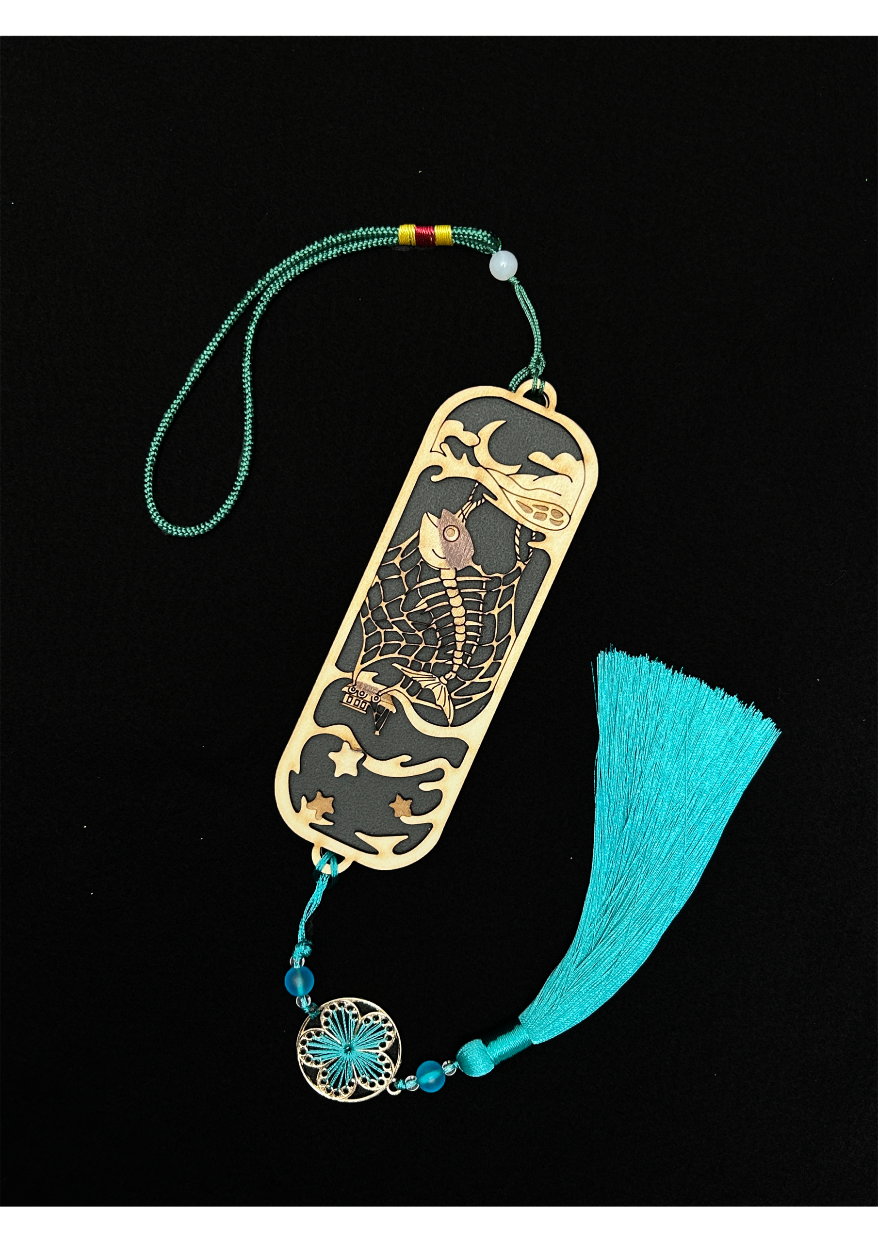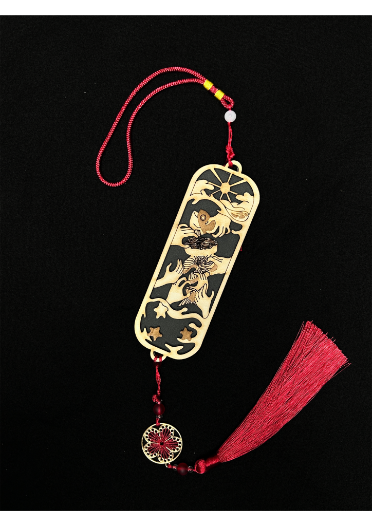 本作品承襲東亞傳統吊飾與書籤設計語彙,融合木頭雕刻、流蘇編織與彩珠點綴等工藝,展現細緻與對比之美。主體為木頭雕板,分為左右兩部分。設計上採用剪影式對比構圖:左側描繪鮭魚在波濤中跳躍,象徵著它逆流而上、對生命充滿渴望與掙扎的本能;右側則描繪鮭魚被網困住,體態僵直、骨骼若隱若現,暗示著生命即將結束,將成為盤中飧。
