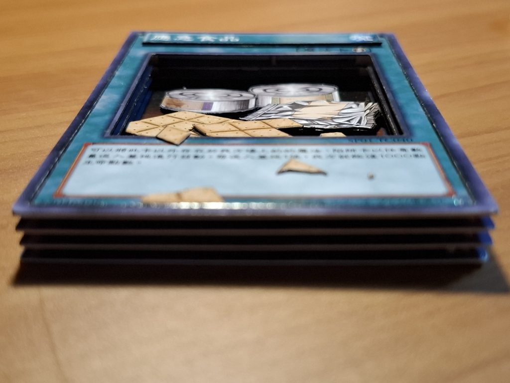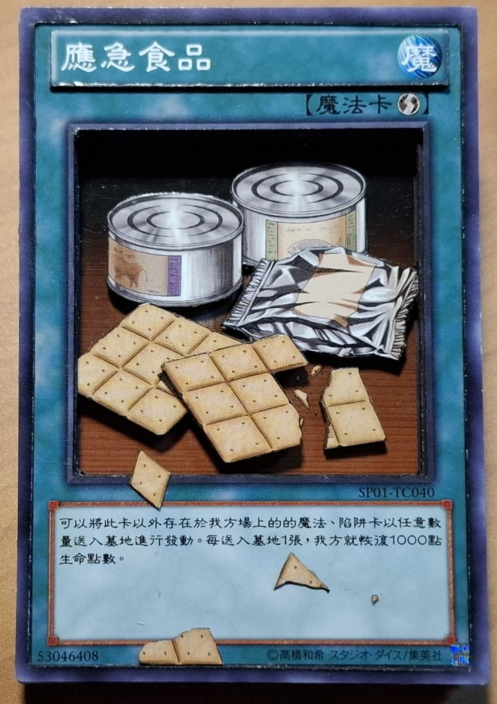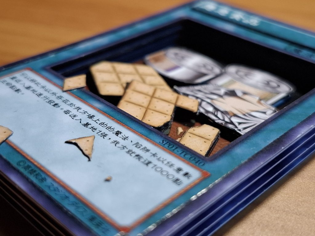 此次作品是應急食品,我在卡圖上增加了餅乾屑屑來讓畫面呈現一種趣味感,彷彿餅乾真的掉下來了一樣。此外,在卡的外框與名稱欄位,我也多加一層讓其有點立體感。