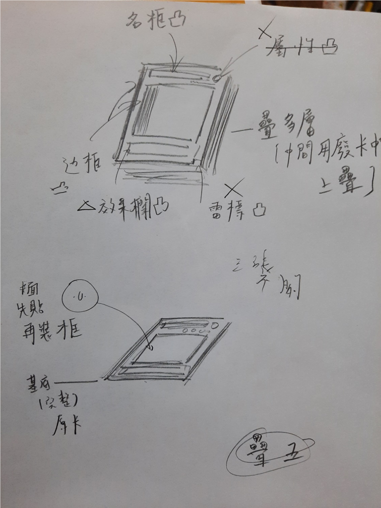 由圖中可知 我先將要的圖放最底下 中間再放廢卡以防我割錯沒有備用可用,框框也是拿廢卡 太細也容易割壞。